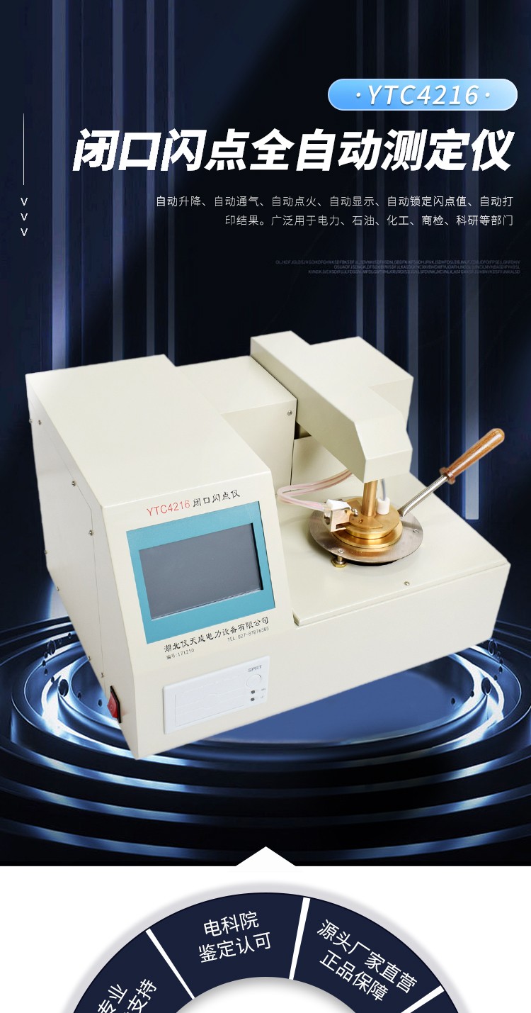 YTC4216閉口閃點全自動測定儀按標準方法升溫、自動升降、自動通氣、自動點火、自動顯示、自動鎖定閃點值、自動打印結果。廣泛用于電力、石油、化工、商檢、科研等部門。符合ISO—2719,GB261—83標準。