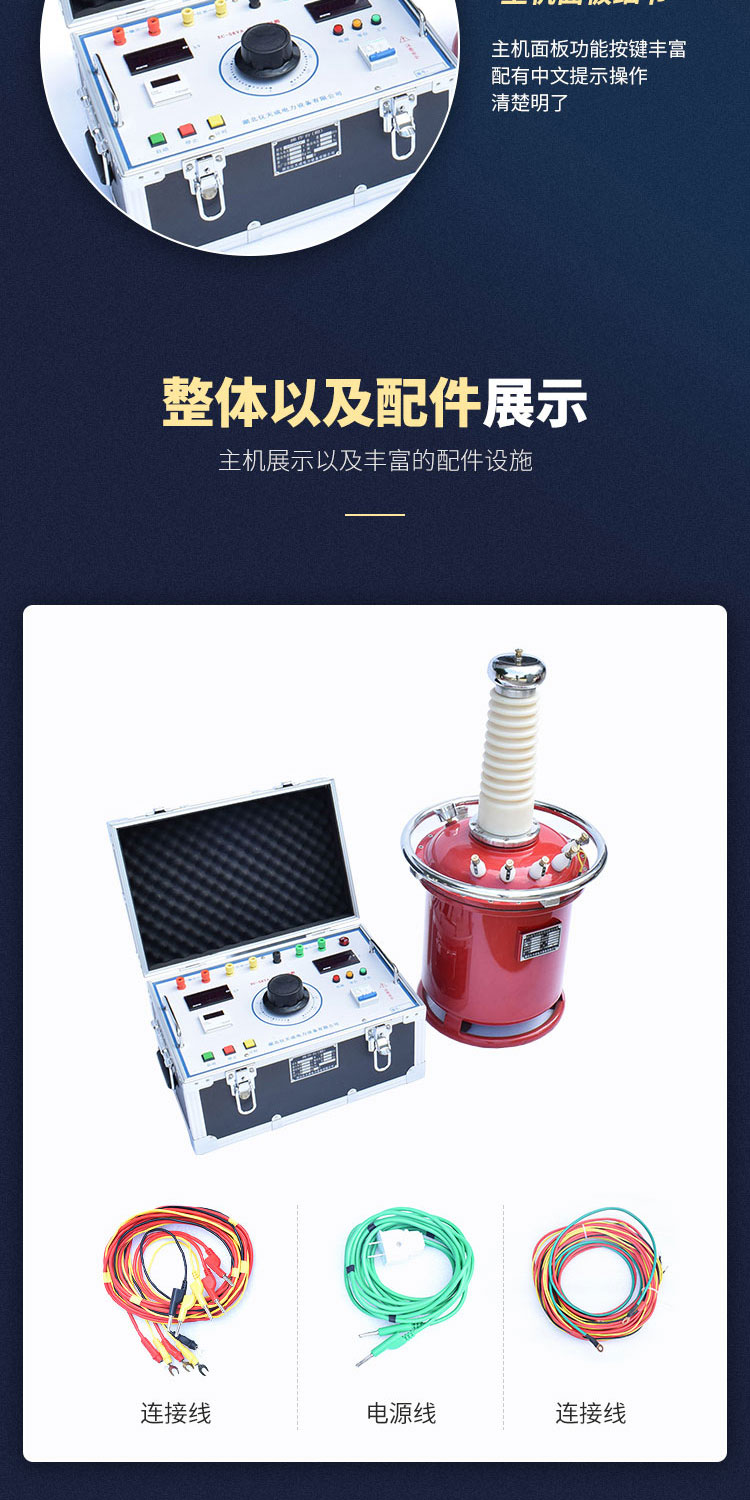 4、直流輸出方式創新,儀器巧妙地將高壓整流硅堆裝在高壓套之內通過短路桿的插入和抽出可變換YDQ是工頻高壓交流輸出還是高壓直流輸出。