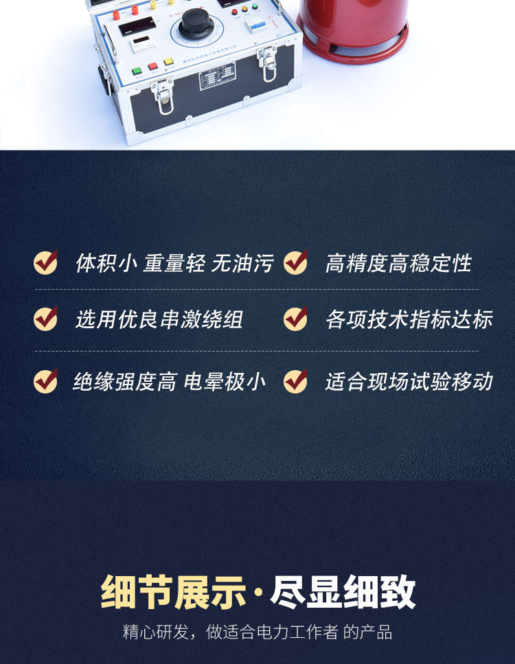 1、使用方便,該充氣變體積小,重量輕,同等功率比油變重量減輕20%-60%,同時潔凈,無油污,勿需維護,不受惡劣氣候環境影響,現場搬運勿須靜止即可做試驗,絕緣強度明顯高于油浸試驗變壓器,電暈極小。