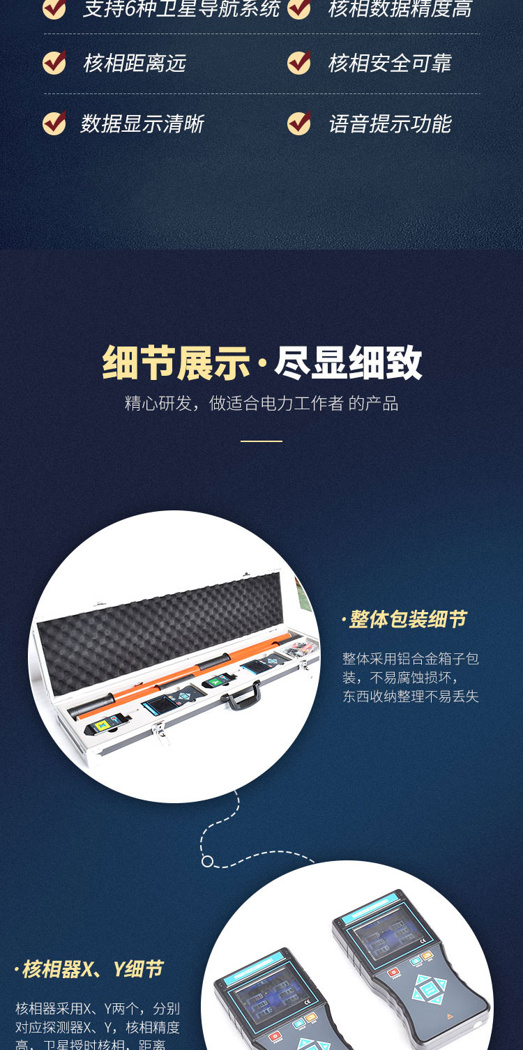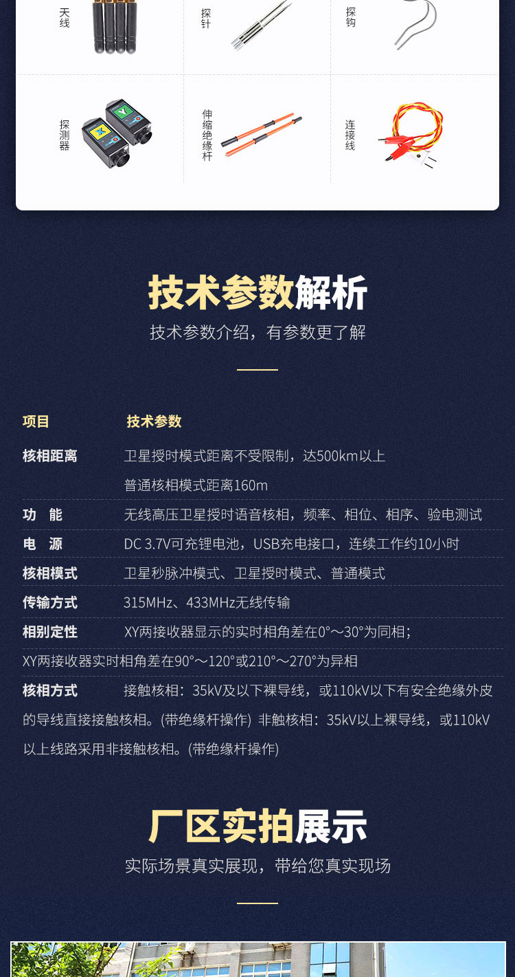 3、測試功能強,空曠地面普通核相距離可達160m,衛星授時核相距離大于500km,能對10V~550kV的電壓線路全智能核相,也可用于高壓線路和完全密封的環網柜低壓感應點核相,