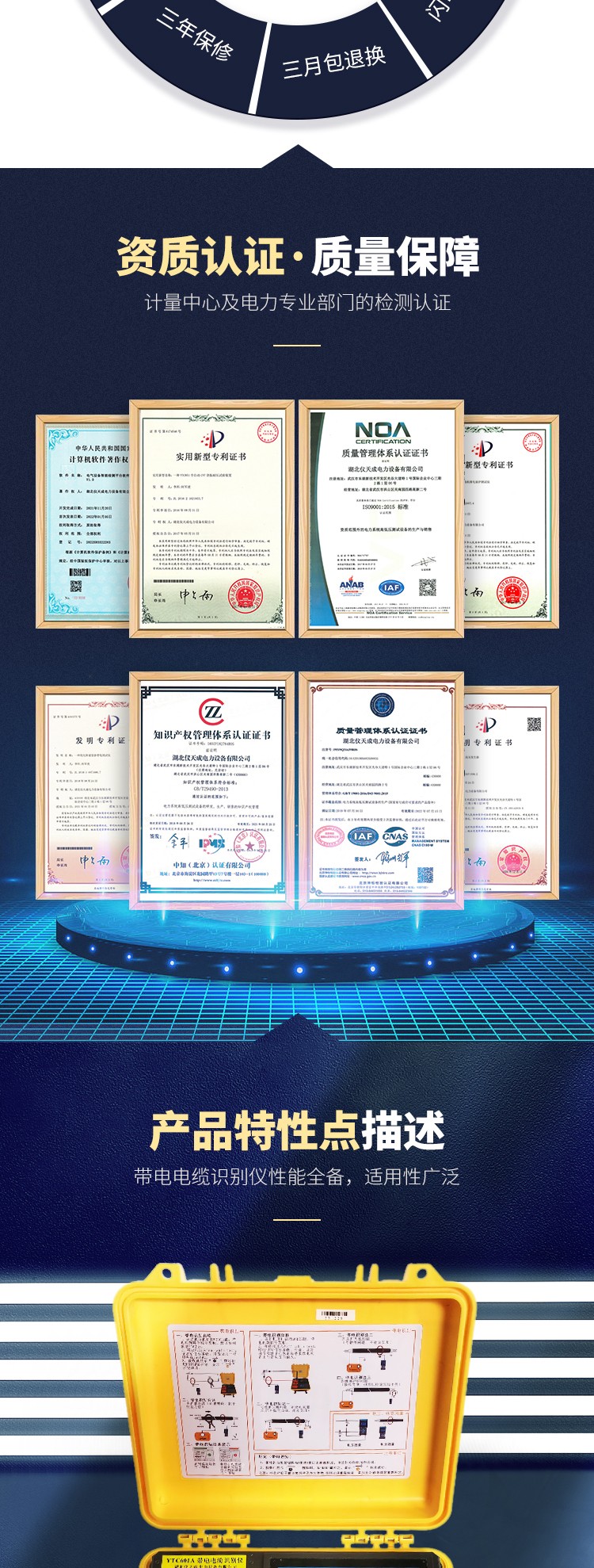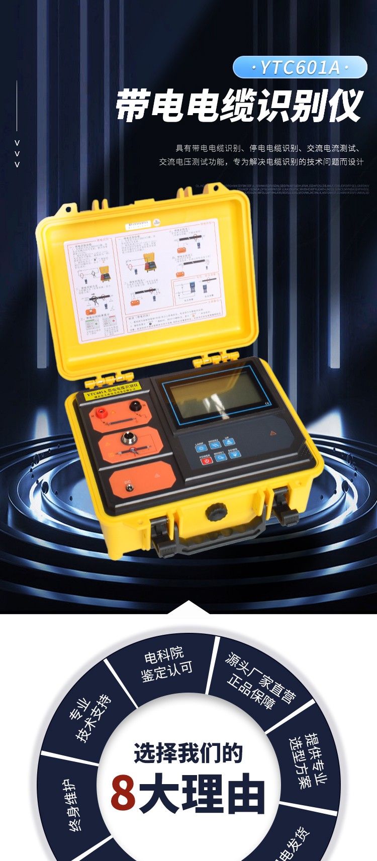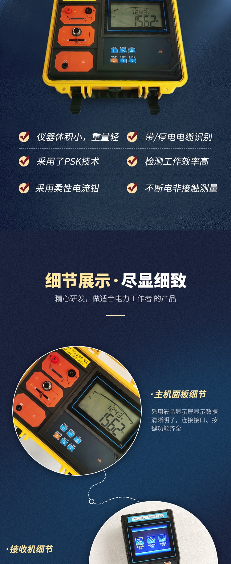 YTC601A 帶電電纜識別儀,又名電纜識別儀、多功能電纜識別儀、智能電纜識別儀,是為電力電纜工程師和電纜工解決電纜識別的技術問題而設計的。用戶通過儀器從多根電纜中準確識別出其中某一根目標電纜,避免誤鋸帶電電纜而引發嚴重事故。電纜識別是從電纜兩端的操作開始的,必須保證電纜兩端的雙重編號準確無誤,本儀器設計采用了PSK技術,結合精準算法。無論現場工作人員的記憶多么可靠,都不能代替專業儀器的識別。本產品同時具有帶電電纜識別、停電電纜識別、交流電流測試、交流電壓測試功能,由發射機、發射電流鉗、接收機、接收柔性電流鉗等組成,帶電電纜識別時,可以在發射端預先標定10條電纜,再到遠端接收識別,大大節省工程人員往返操作時間,提高工作效率。