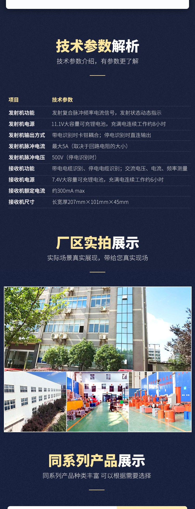 接收機:為手持設備,3.5寸彩色液晶屏,內置高速微處理器,結合精準算法,對發射機的脈沖編碼電流信號進行識別并解碼,帶電識別時具有發射信號標定功能,同時可以標定10條電纜,顯示信號強度和檢測結果,關機自動保存標定數據;彩色刻度條動態顯示,一目了然,電纜識別成功打√,非目標電纜打×,能快速自動識別目標電纜。同時可測試電壓量程為AC 0.00V~600V(50Hz/60Hz),可測交流電流量程為AC 0.00A~5000A(50Hz/60Hz),可測電流頻率45Hz~70Hz。