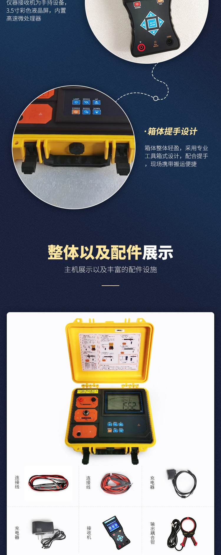 發射機:帶電電纜識別、停電電纜識別時發射信號給目標電纜,內置大功能率可充鋰電池,自動阻抗匹配,全自動保護。發射機采用一體化專用工具箱式設計,用聚丙烯塑膠作為原料,添加新型復合填充料一次注塑成形,密度小、強度、剛度、硬度、耐磨性、耐熱性、絕緣性能更優越,其箱體能承受約200kg的壓力,主機超大LCD實時顯示剩余電池電量,白色背光、發射信號動態指示,一目了然。