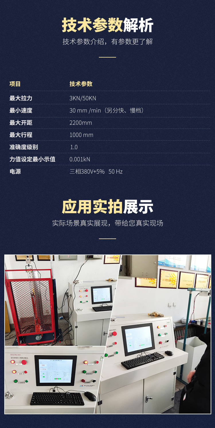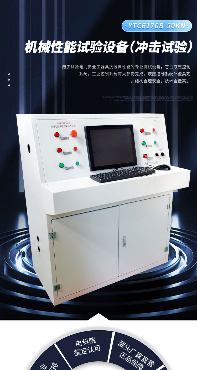 YTC6170B-50kN 機械性能試驗設備(沖擊試驗)是按照《國家電網公司電力安全工作規程》的要求用于試驗電力安全工器具抗拉伸性能的專業測試設備,它由液壓控制系統,工業控制系統兩大部份完成,液壓控制系統外型美觀,結構合理安全,技術含量高。工業控制系統采用工控機操作,集信號采集、轉換、處理、數據運算、數據庫管理,實時顯示及執行元件的控制等功能于一身,它廣泛適用于電力安全工器具(大腰帶、小腰帶、安全繩等)的安全檢測,鋼纜、繩纜、葫蘆、雙鉤、滑車等各類起重工具的拉力試驗,還可以為線路、金具、絕緣瓷瓶等機械進行靜載荷試驗。